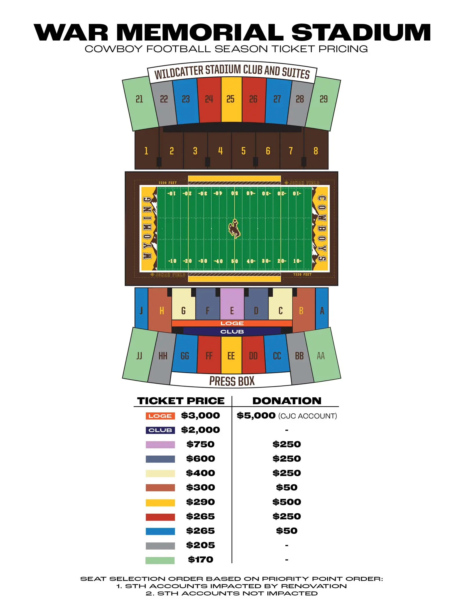 The War Memorial Stadium renovation will begin immediately after the last Wyoming regular season home football game. Current season ticket holder's priority point status, as of Dec. 11, 2023, will determine the selection order. Your appointment times will be communicated to you by the Cowboy Joe Club via email and mail in late December. Selection appointments will be made based on priority point ranking beginning in early January and continuing through February.